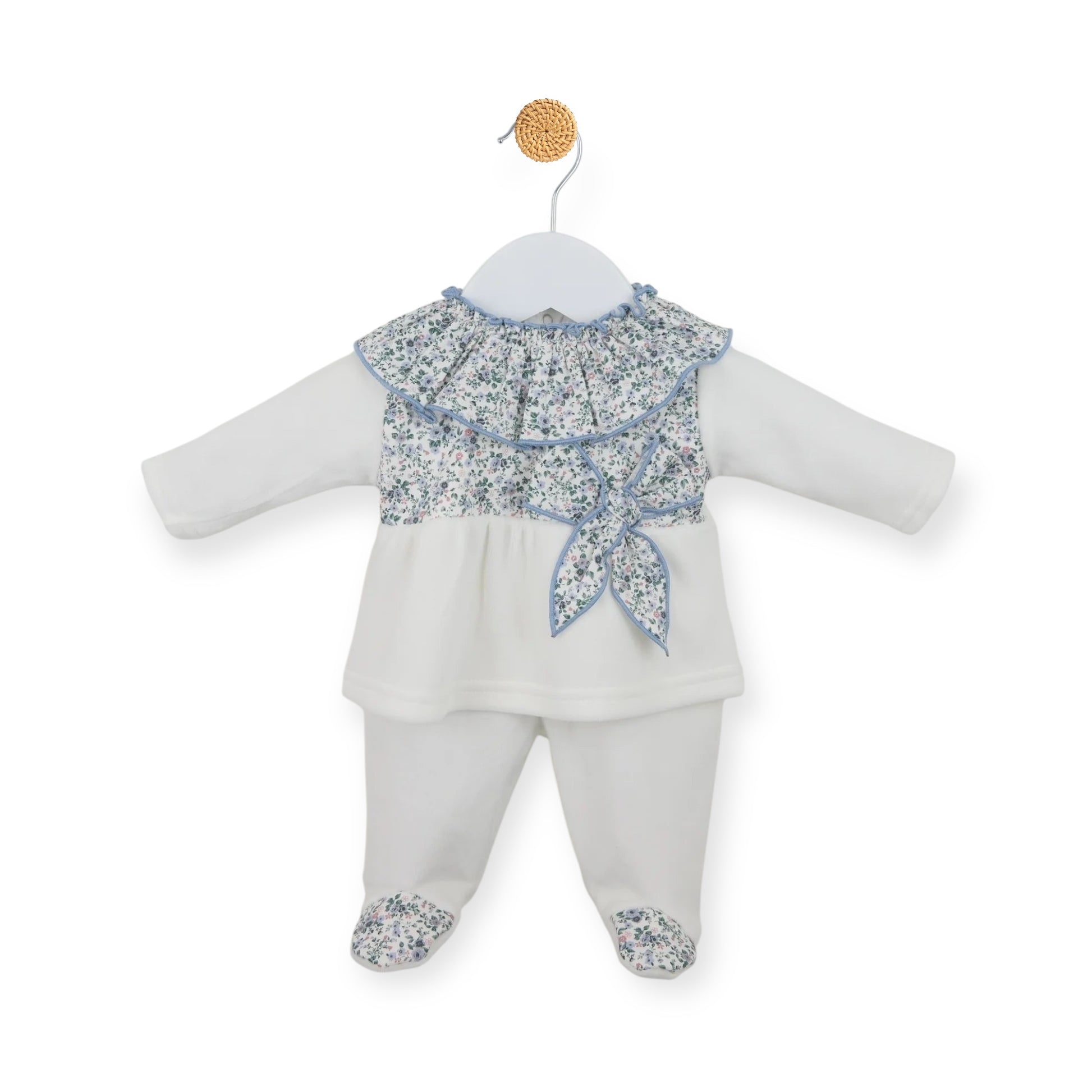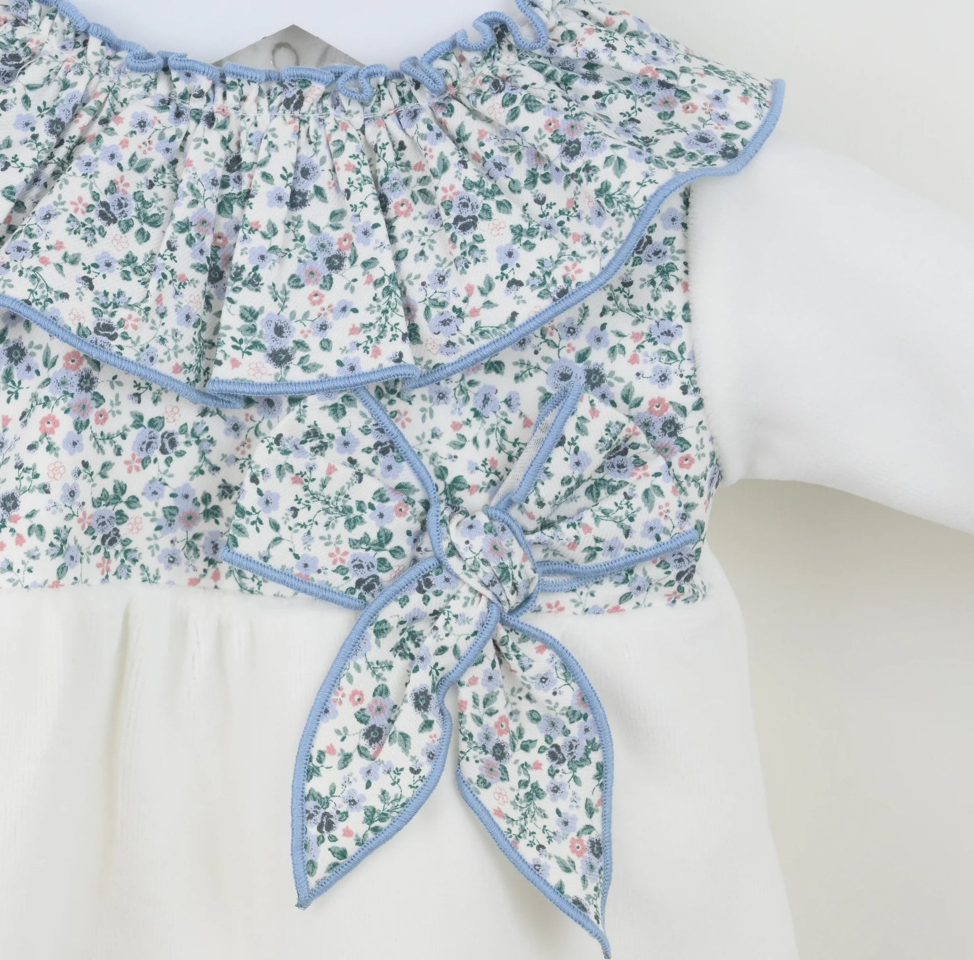 The Amelia Floral Outfit combines gentle comfort with charming design, crafted from soft pale ivory velour to keep your child cozy. The bodice, collar, and feet feature an adorable blue ditsy floral print that adds a delicate, timeless touch to this outfit. Perfect for both everyday wear and special occasions, it offers a snug fit that ensures ease of movement without sacrificing style. This ensemble is ideal for parents seeking quality and elegance in a soft, breathable fabric that is kind to sensitive skin.