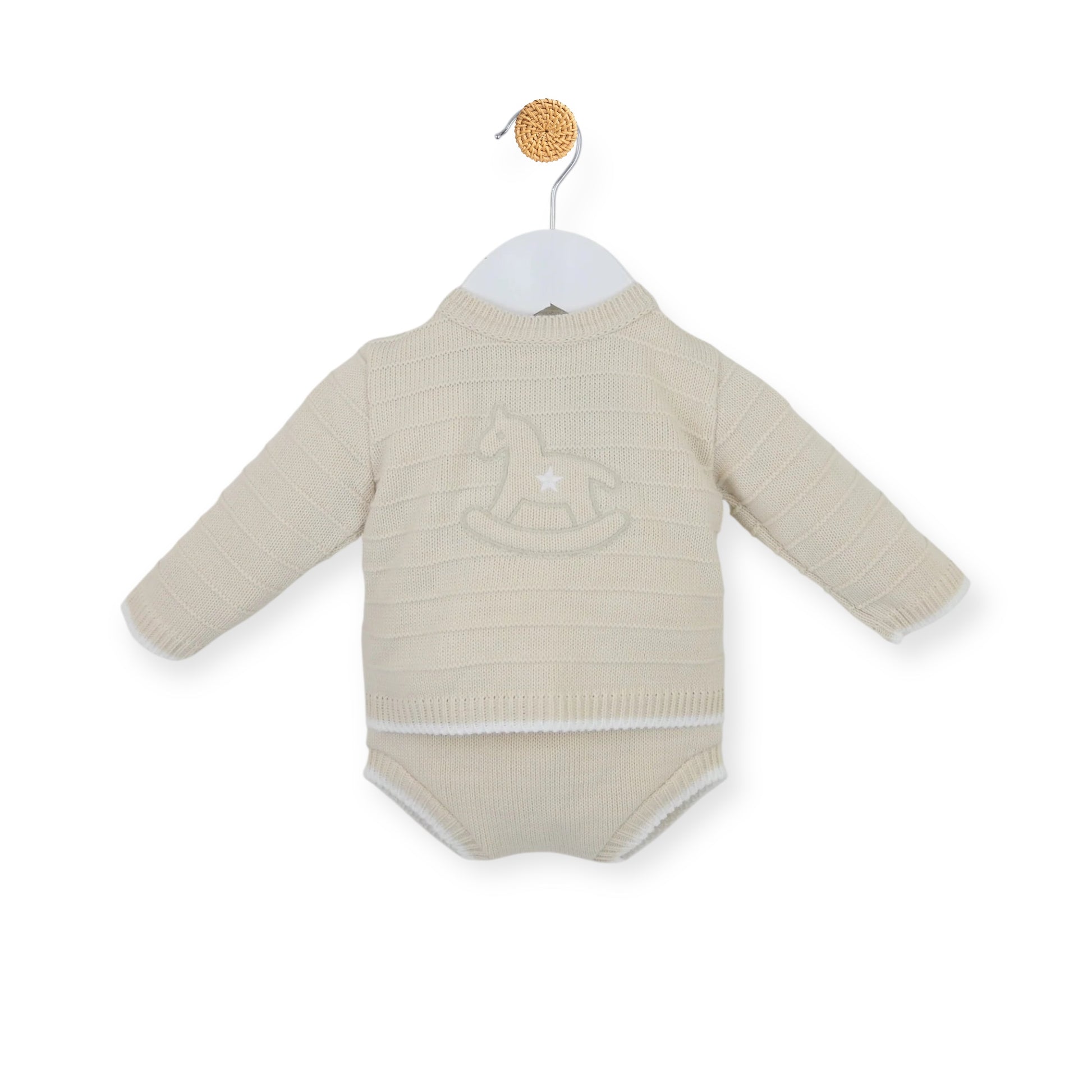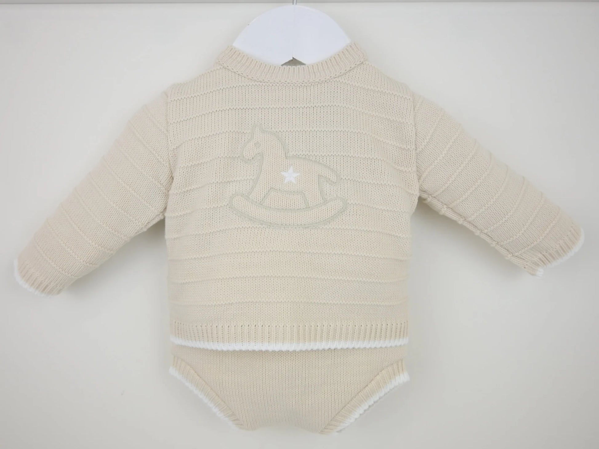 A timeless addition to Pex Autumn/Winter range, this outfit features a luxuriously soft knit adorned with stylish textured stripes and a charming rocking horse applique. It comes with coordinating knitted jam pants for a perfectly matched look.