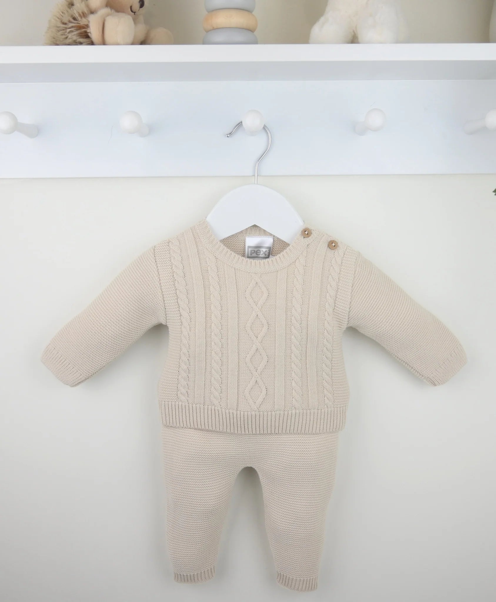 This charming two-piece set is crafted from ultra-soft yarn in a lovely biscuit. The top features elegant cable knit detailing and two adorable wooden buttons on the shoulder. Paired with matching trousers that offer a snug elasticated waist, this outfit combines supreme comfort with timeless style.