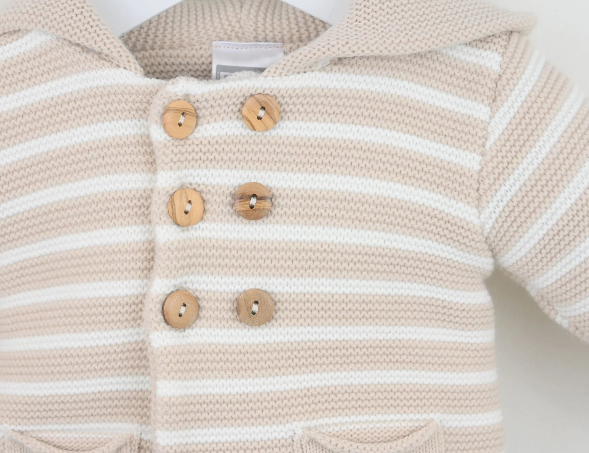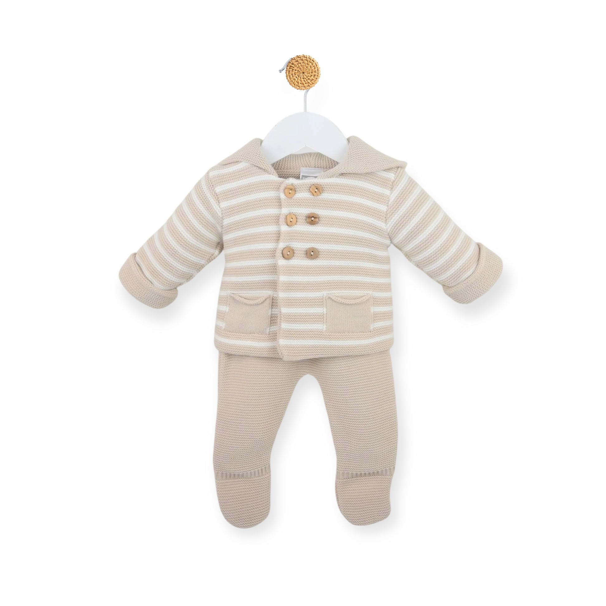 Keep your little one warm this winter with this charming Biscuit Joseph Outfit. The thick, double-knit jacket offers cozy comfort, highlighted by stylish stripes and elegant wooden buttons. Matching knitted bottoms come with a soft elastic waistband and fully covered feet, ensuring a snug and comfortable fit all day long.