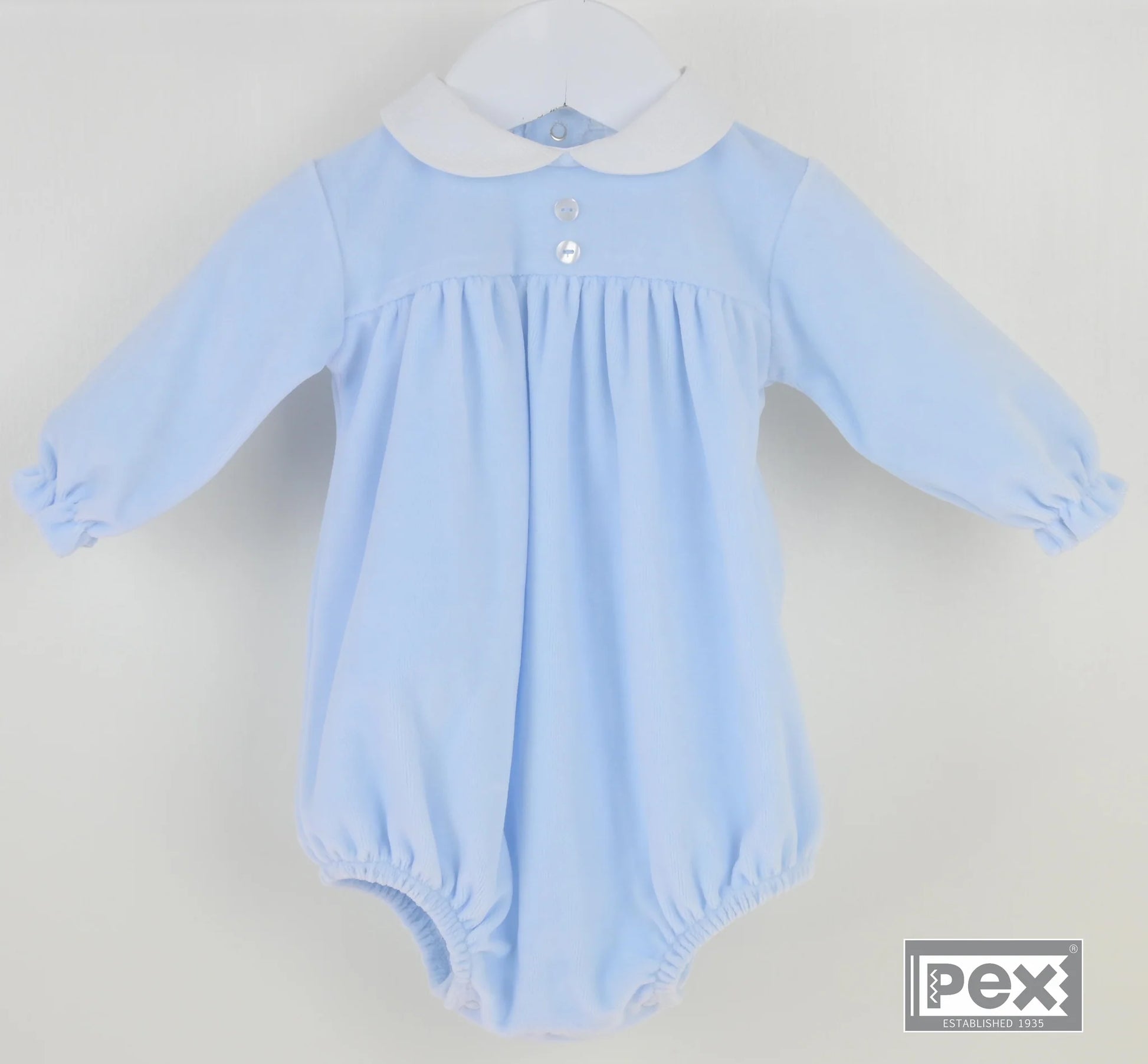 Crafted from soft pastel blue velour, this adorable romper features a crisp white Peter Pan collar and two decorative buttons on the bodice. The Blue Aspen Romper combines delightful style with cozy warmth, making it the perfect choice for your little one’s comfort.