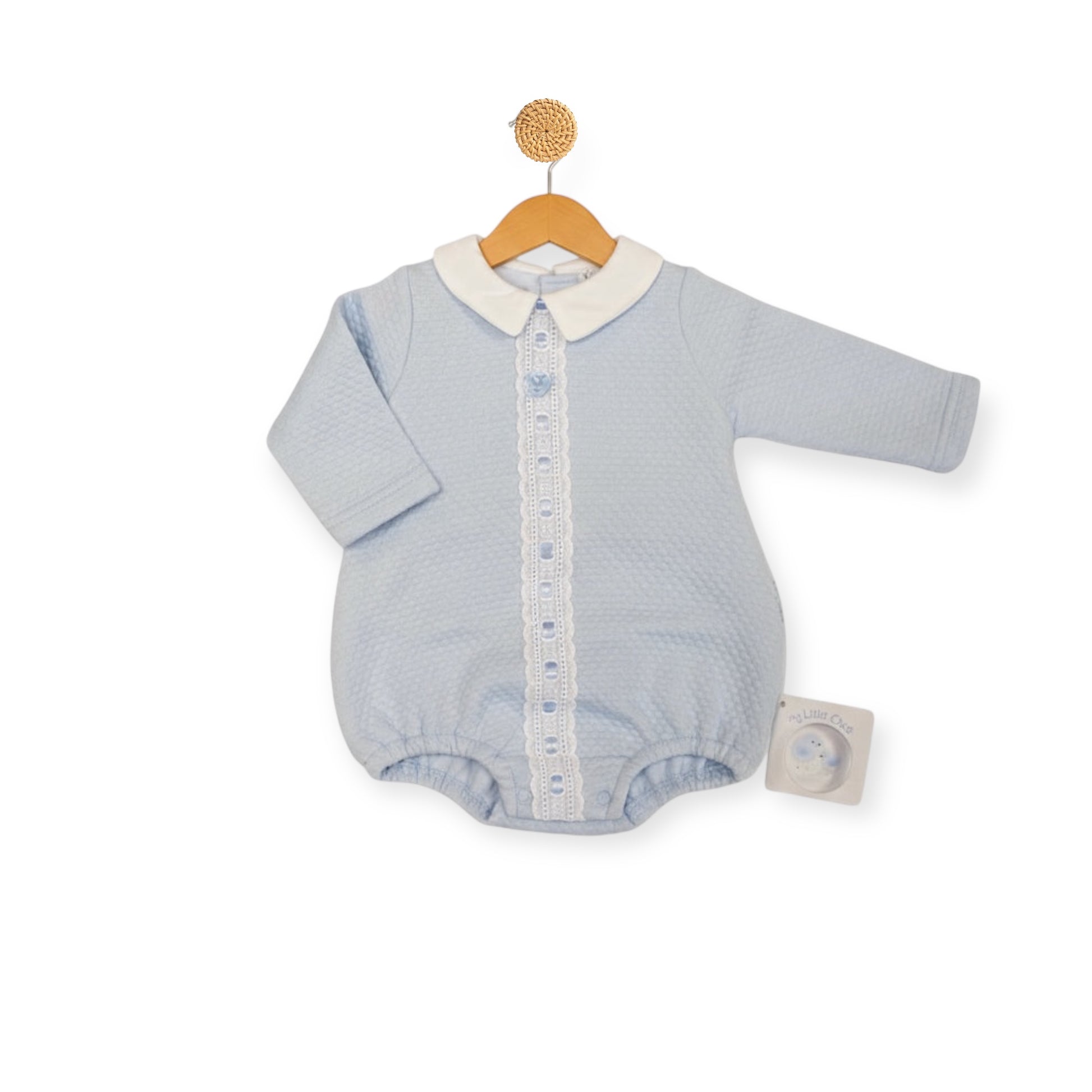 Dress your baby boy in this charming blue romper featuring a sweet bow and delicate lace accents. Crafted by My Little Chick from a cozy mix of 65% polyester and 35% cotton, it’s designed for comfort and cuteness. Available in NB, 0-3, and 3-6 month sizes, it’s perfect for tiny explorers full of charm.