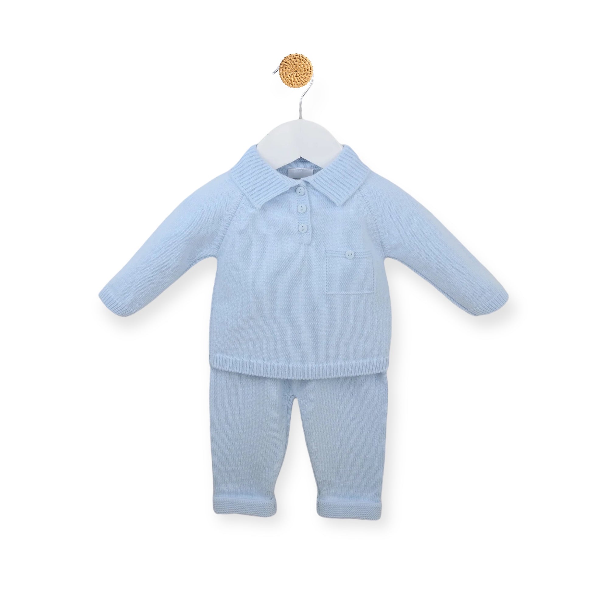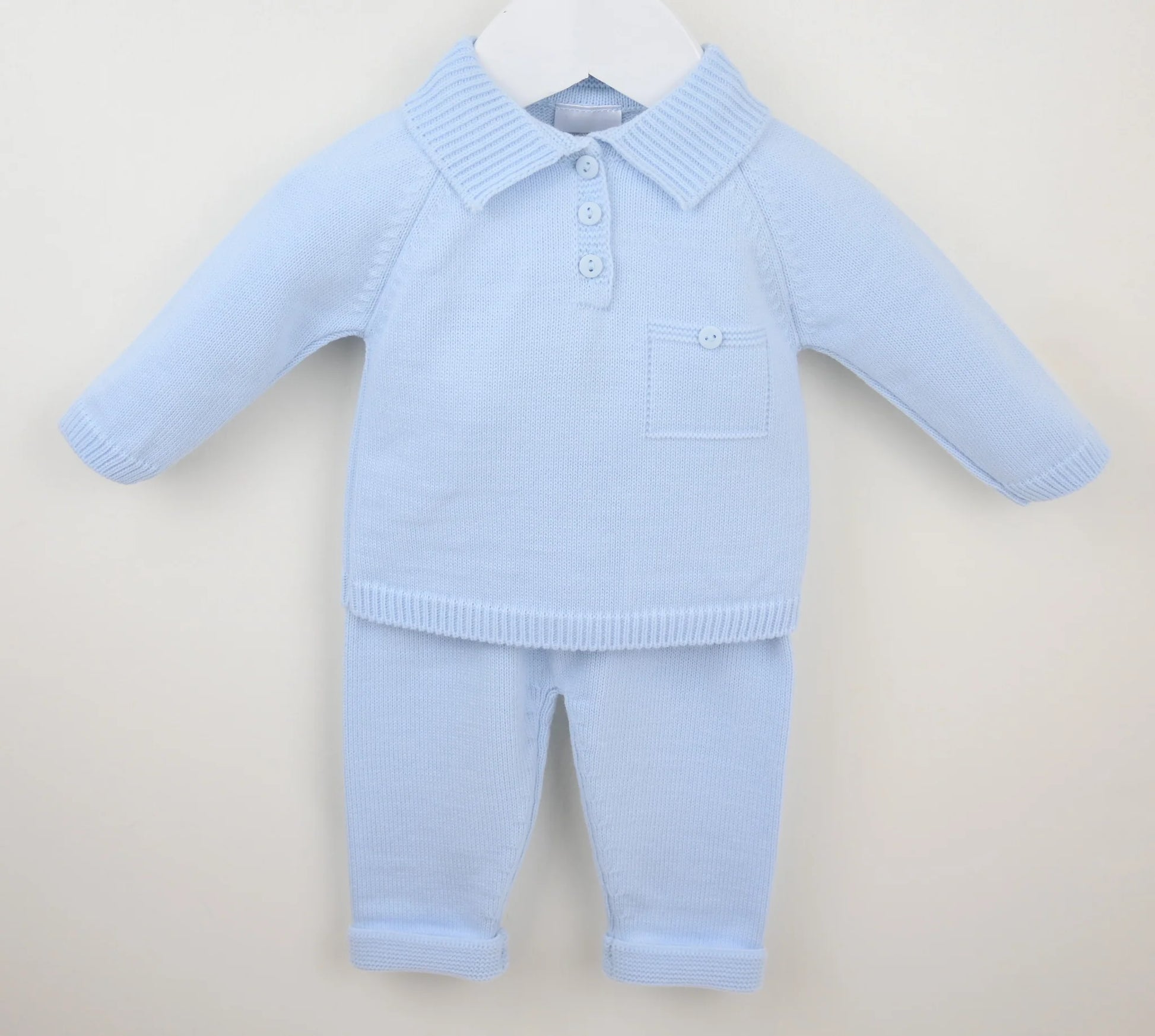 Louis is a stunning new piece in our knitwear range, crafted from a gentle pastel blue yarn. The top features a stylish pique collar with button detailing at the neck, while the trousers offer an elasticated waistband to ensure a comfortable fit throughout the day.