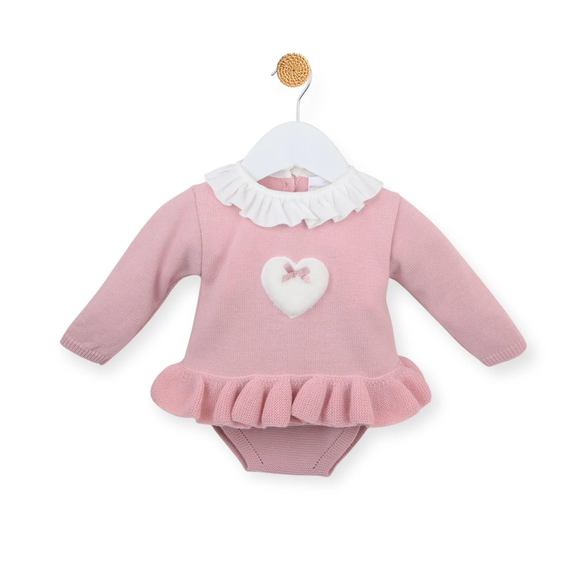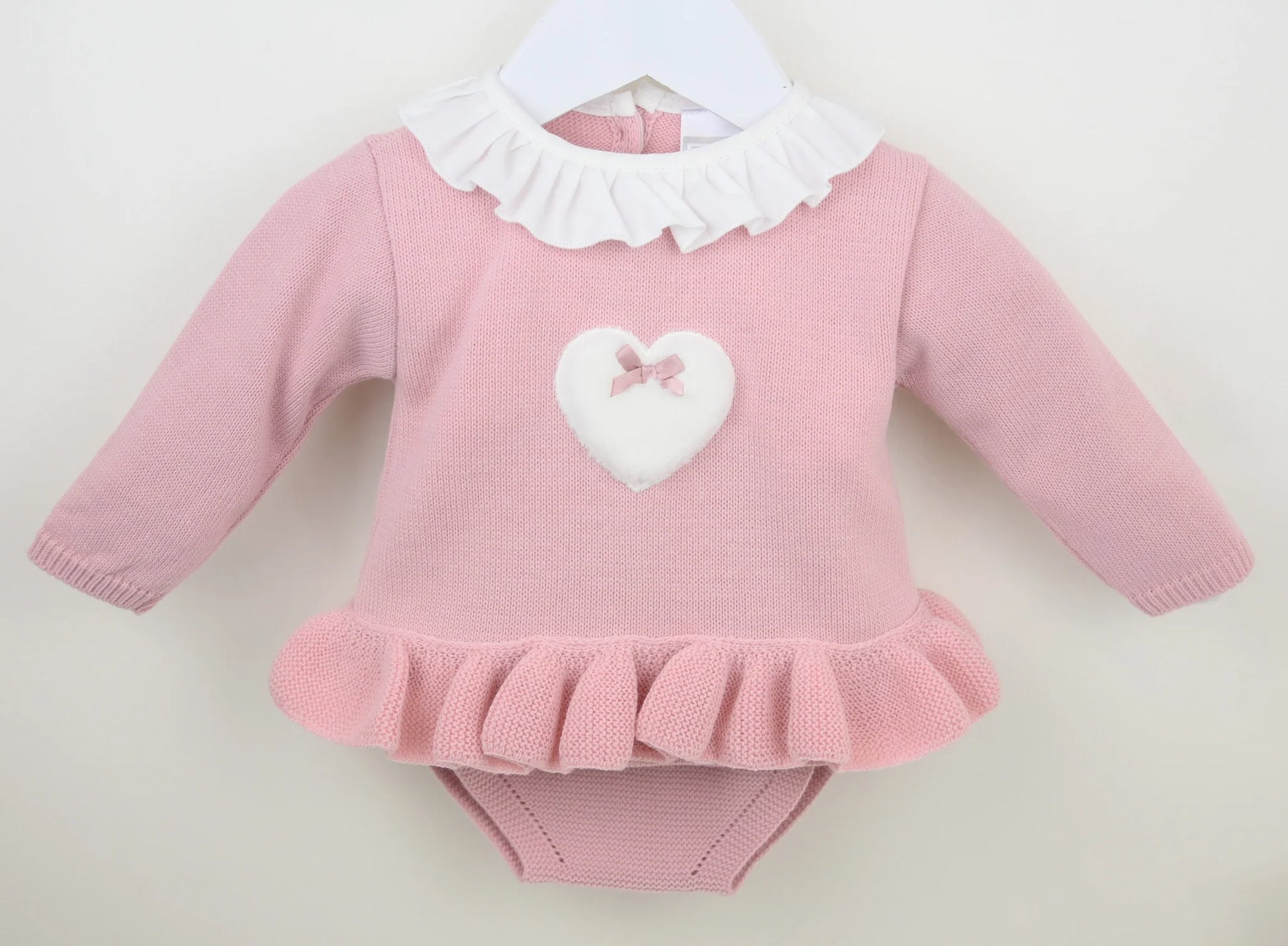 Crafted from ultra-soft yarn in a dusky pink, this outfit features a sweet frilled collar on the top adorned with a fluffy heart and bow on the chest. It’s perfectly paired with an adorable set of matching jam pants for a delightful look.