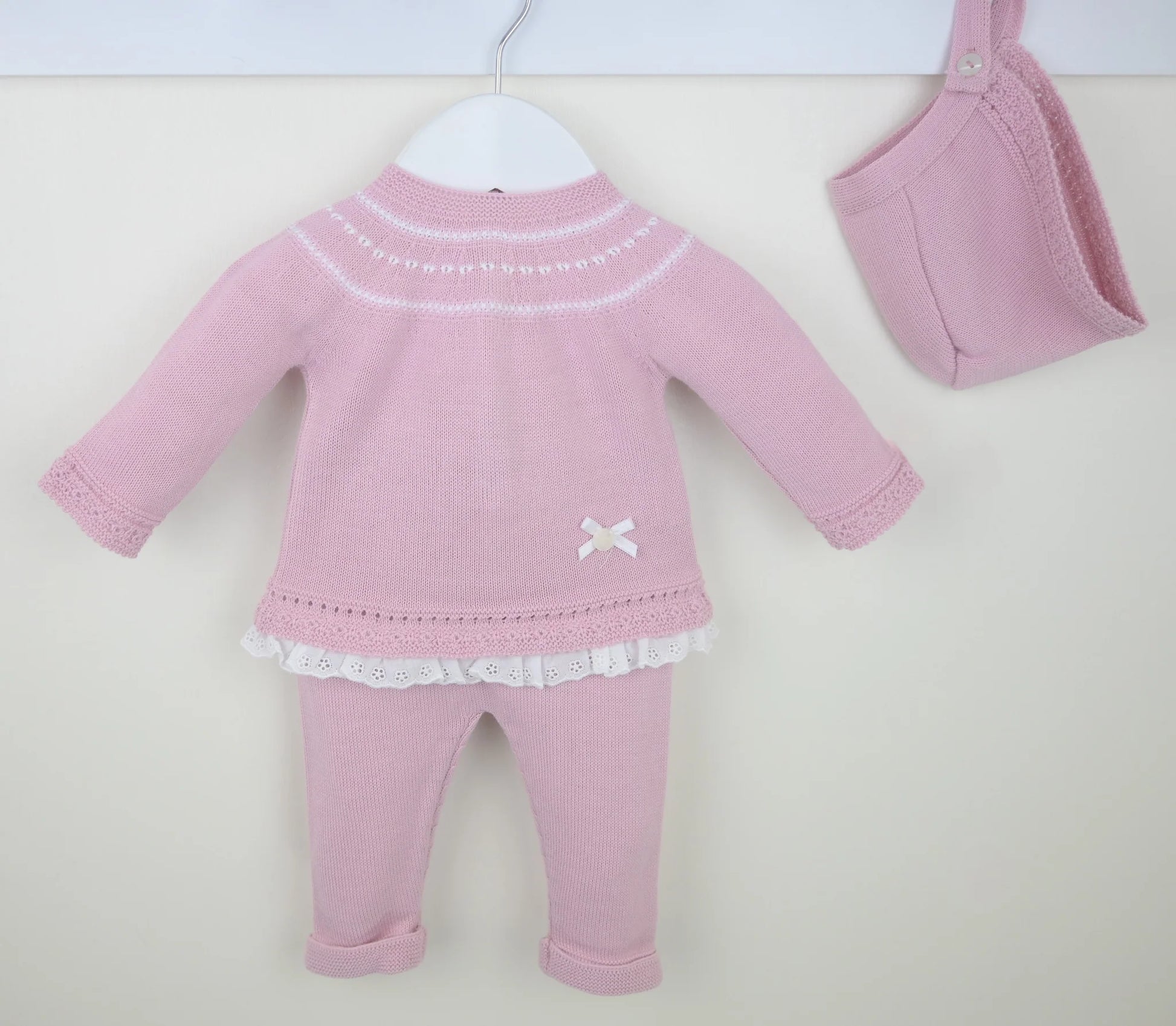 This charming three-piece knitted set for baby girls features a delicate dusky pink yarn. The top is detailed with contrasting stripes at the neckline, a graceful white lace-trimmed hem, and a satin bow at the waist for added elegance. Convenient buttons at the back make dressing easy. The matching bottoms offer a comfortable fit with an elasticated waist, perfect for all-day wear.