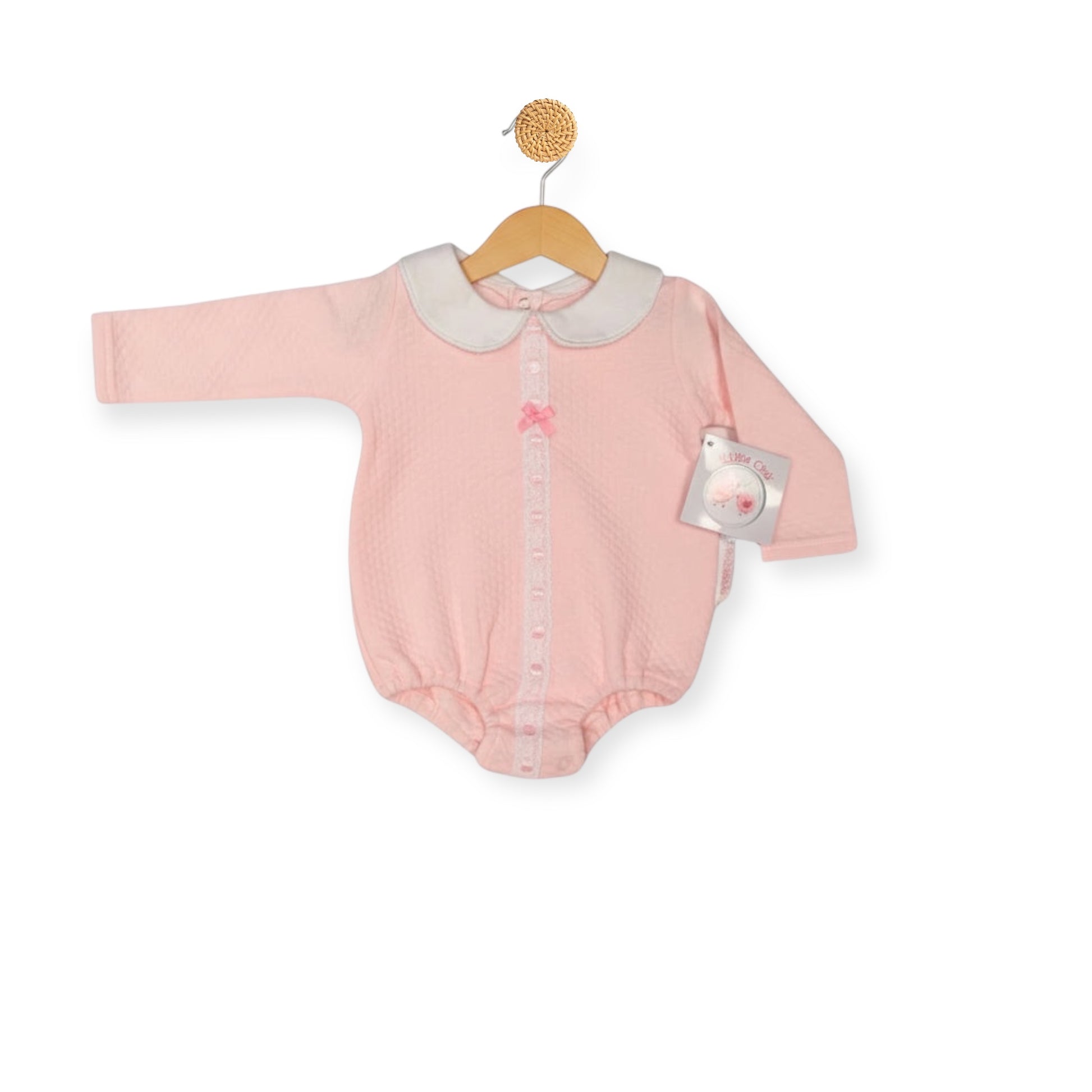 Dress your baby girl in this charming pink romper featuring a sweet bow and delicate lace accents. Crafted by My Little Chick from a cozy mix of 65% polyester and 35% cotton, it’s designed for comfort and cuteness. Available in NB, 0-3, and 3-6 month sizes, it’s perfect for tiny explorers full of charm.