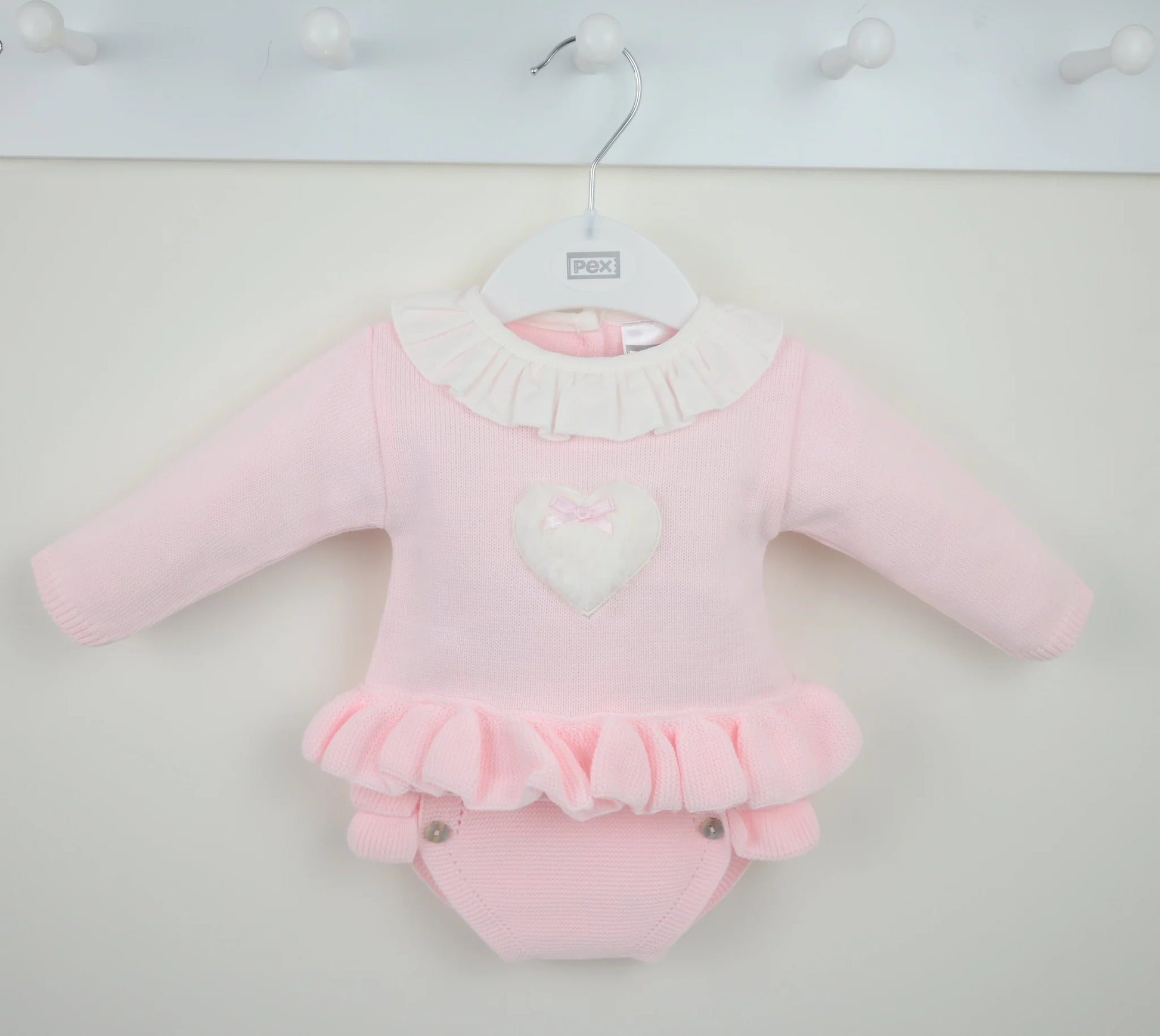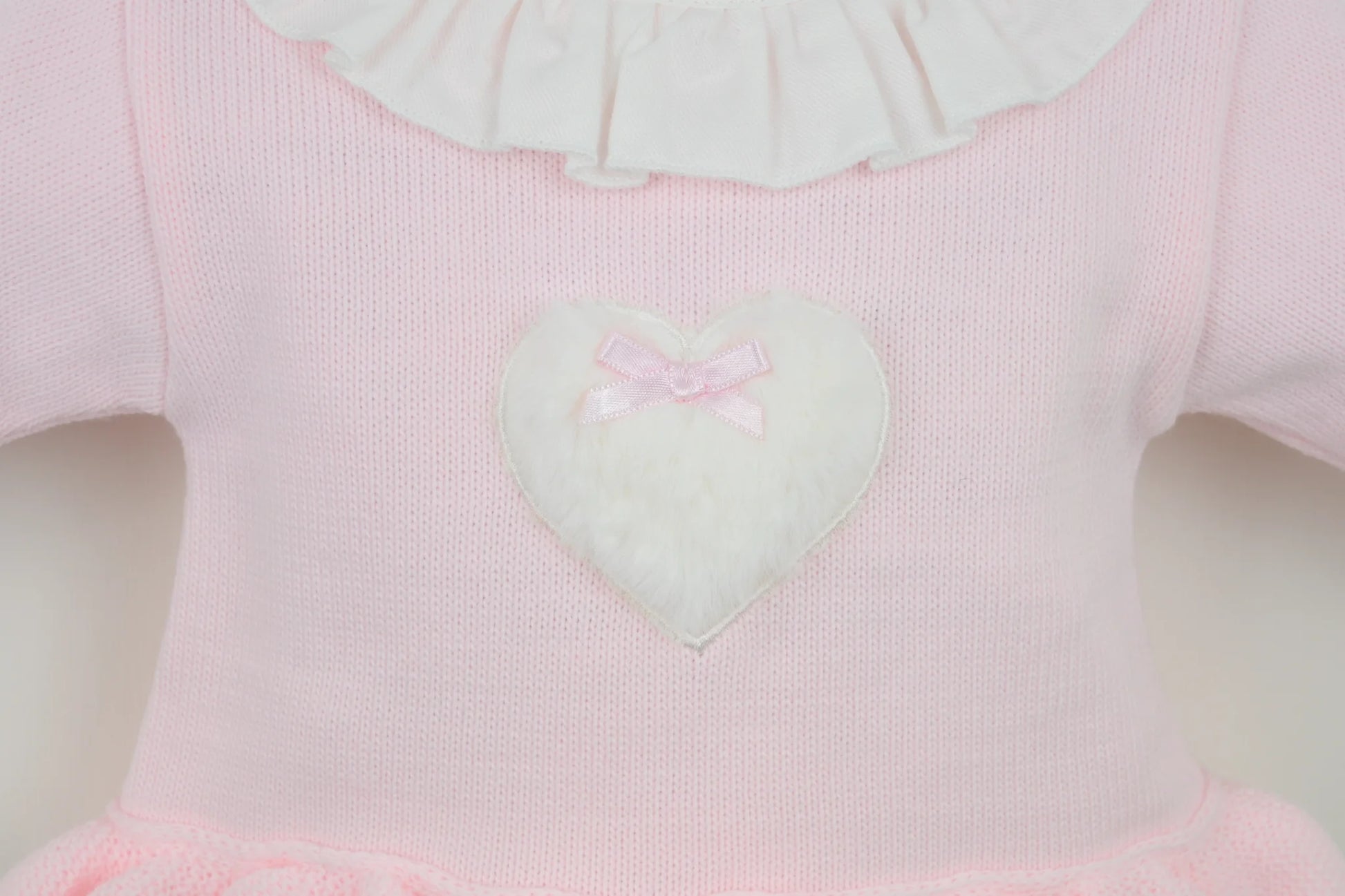 Crafted from ultra-soft yarn in a pastel pink, this outfit features a sweet frilled collar on the top adorned with a fluffy heart and bow on the chest. It’s perfectly paired with an adorable set of matching jam pants for a delightful look.