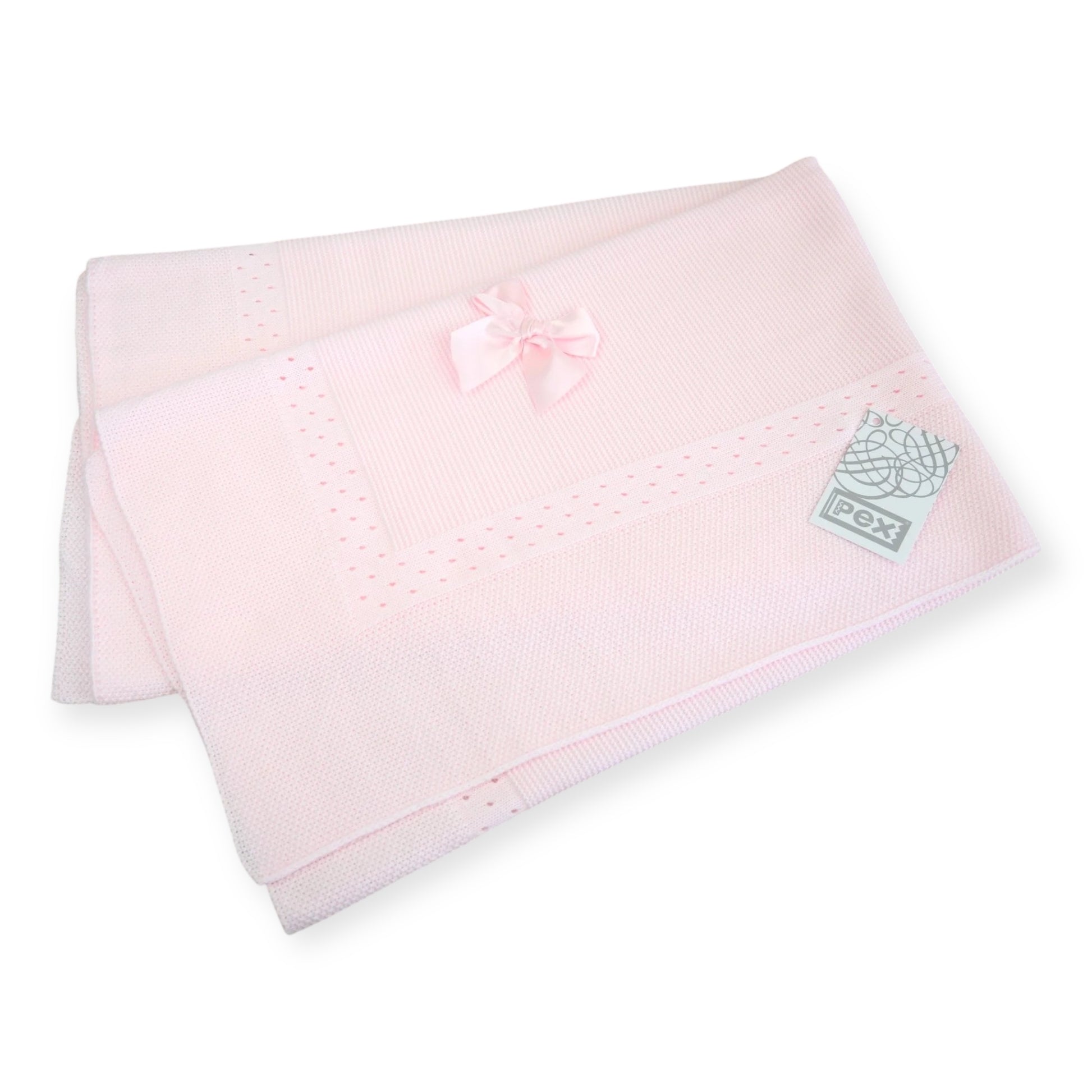 This charming baby shawl in pale pink is made from super soft acrylic. Its classic square shape features a neat border finished with a satin ribbon bow. Measuring 100cm by 100cm, it’s the perfect cozy gift for a newborn.