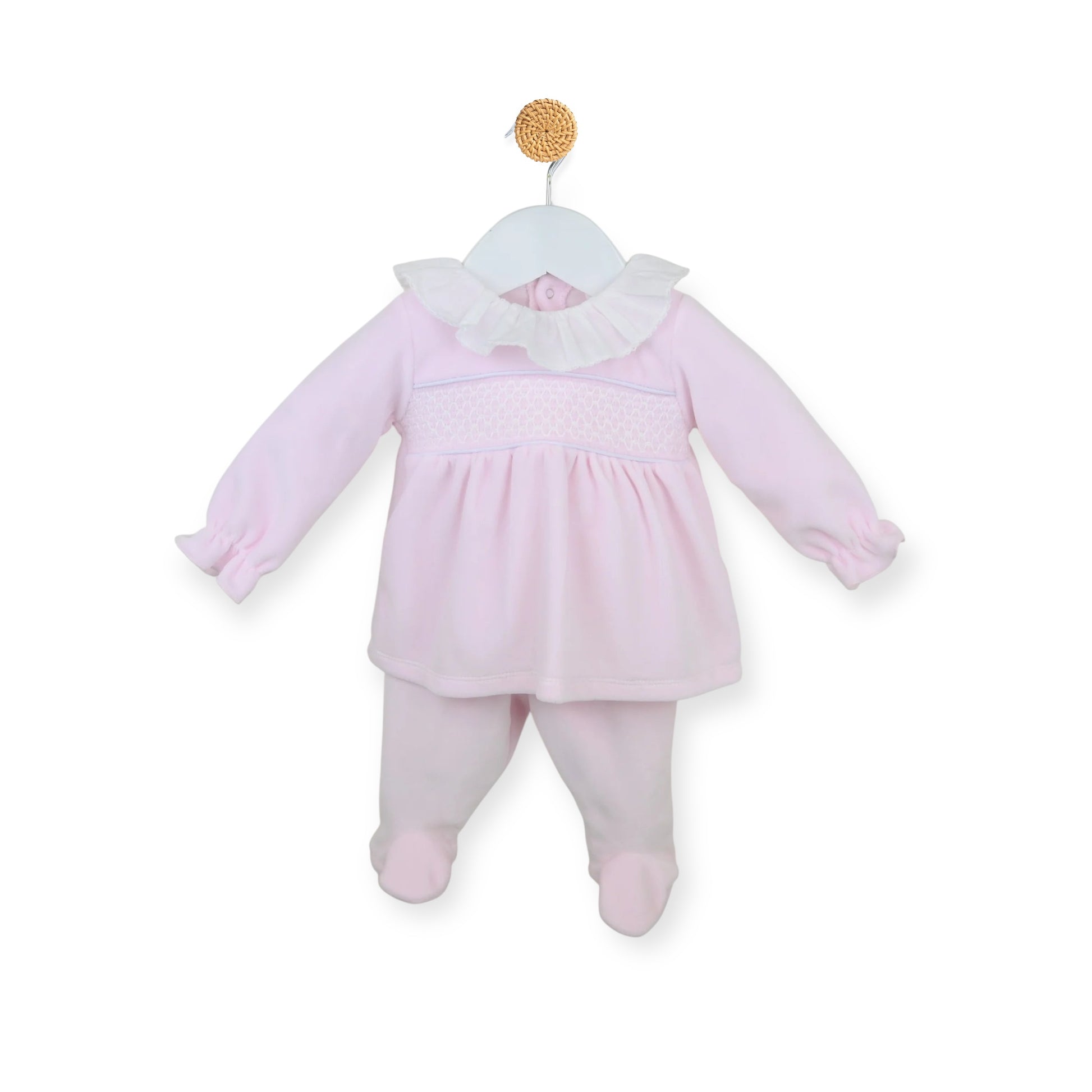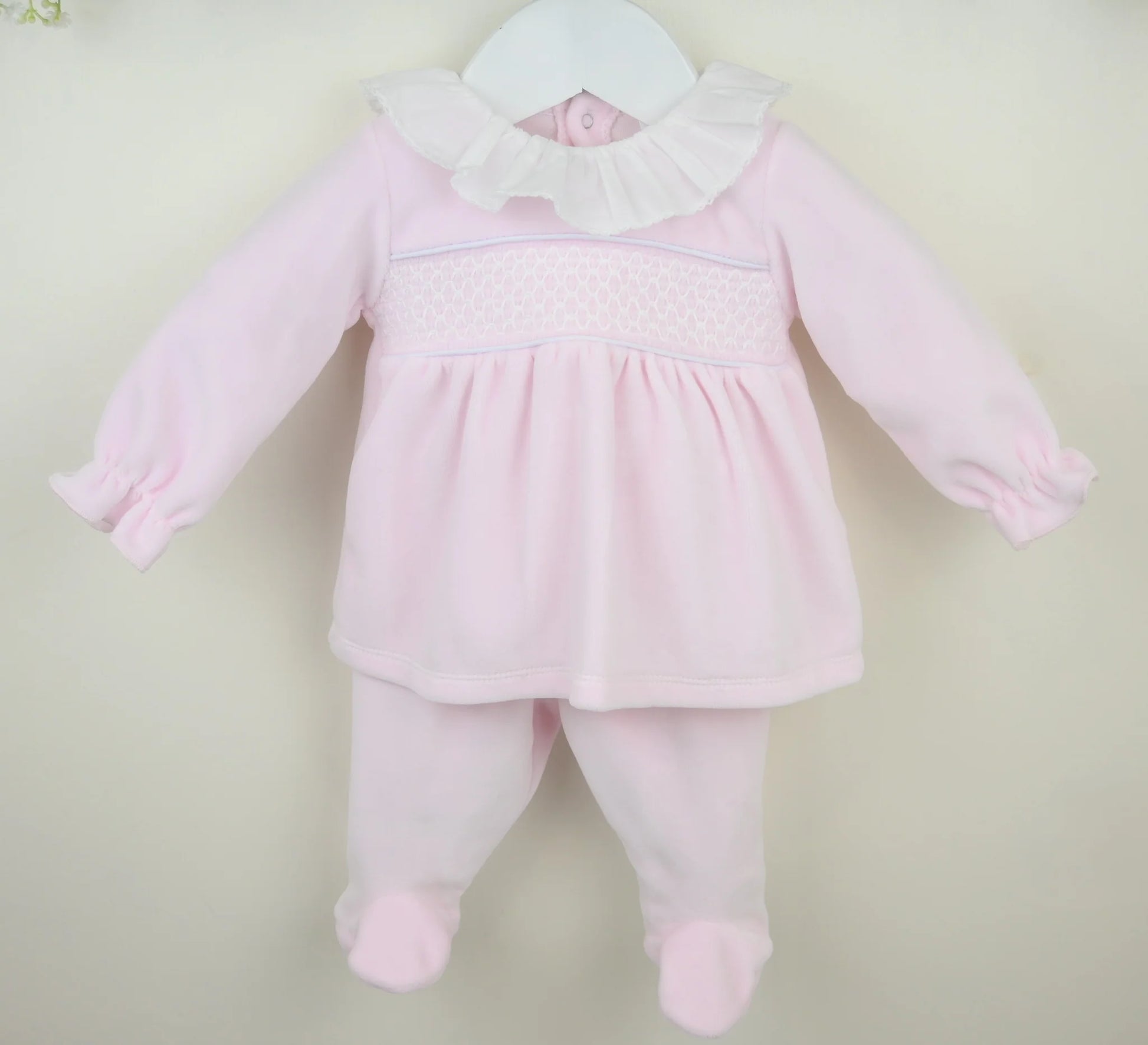 This charming two-piece outfit for baby girls is made from soft cotton velour for ultimate comfort. It features a quilted chest panel with white contrast stitching and a delicate white cotton collar with gentle frills. The matching trousers come with enclosed feet, making it a perfect combination of style and coziness for your little one.