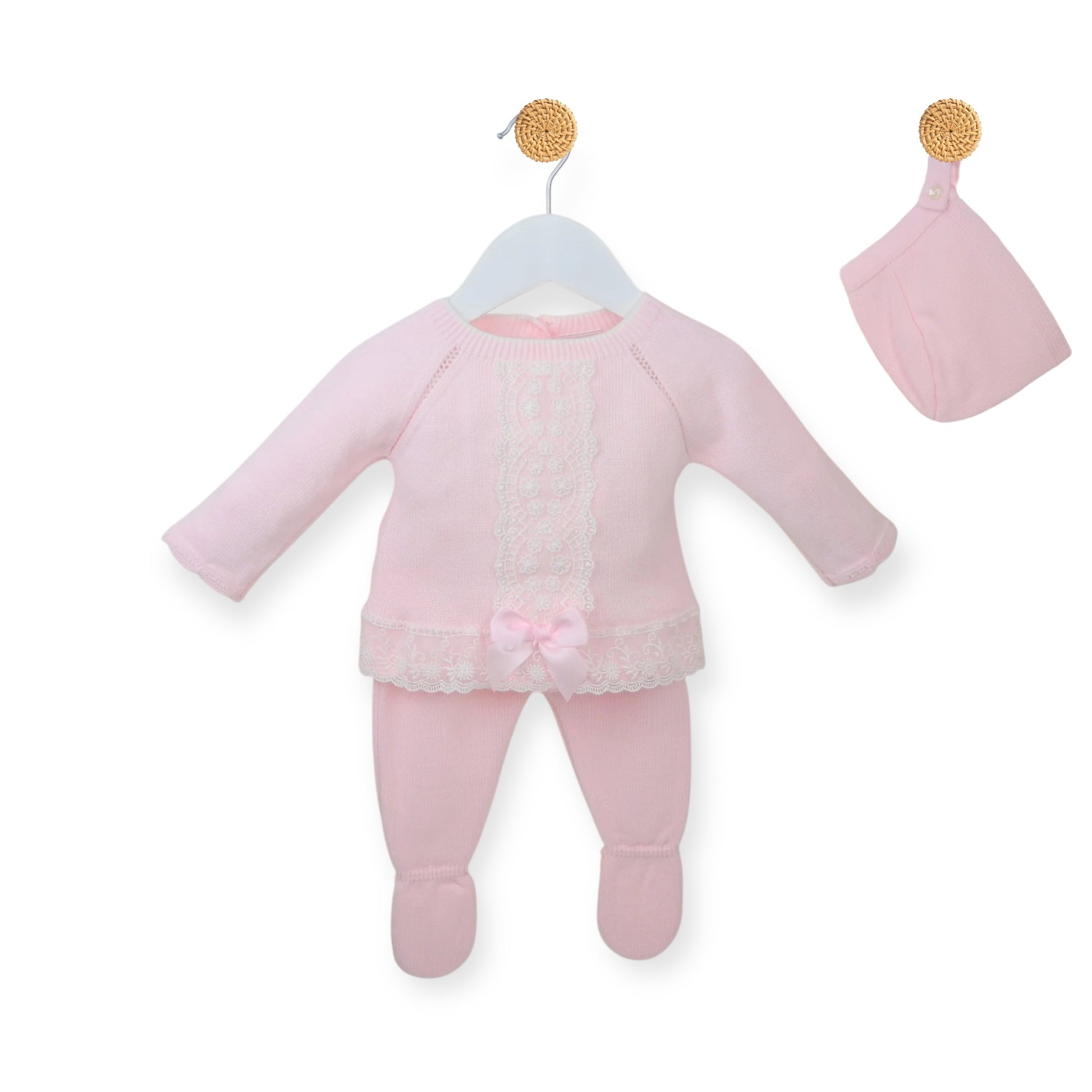 This charming baby two-piece set is crafted from a luxurious, supersoft ecru yarn. It features a detailed lace panel along the front and hem, complemented by a delicate ribbon bow. The coordinating trousers offer an elasticated waistband for maximum comfort and snug enclosed feet. A matching bonnet completes this elegant ensemble.