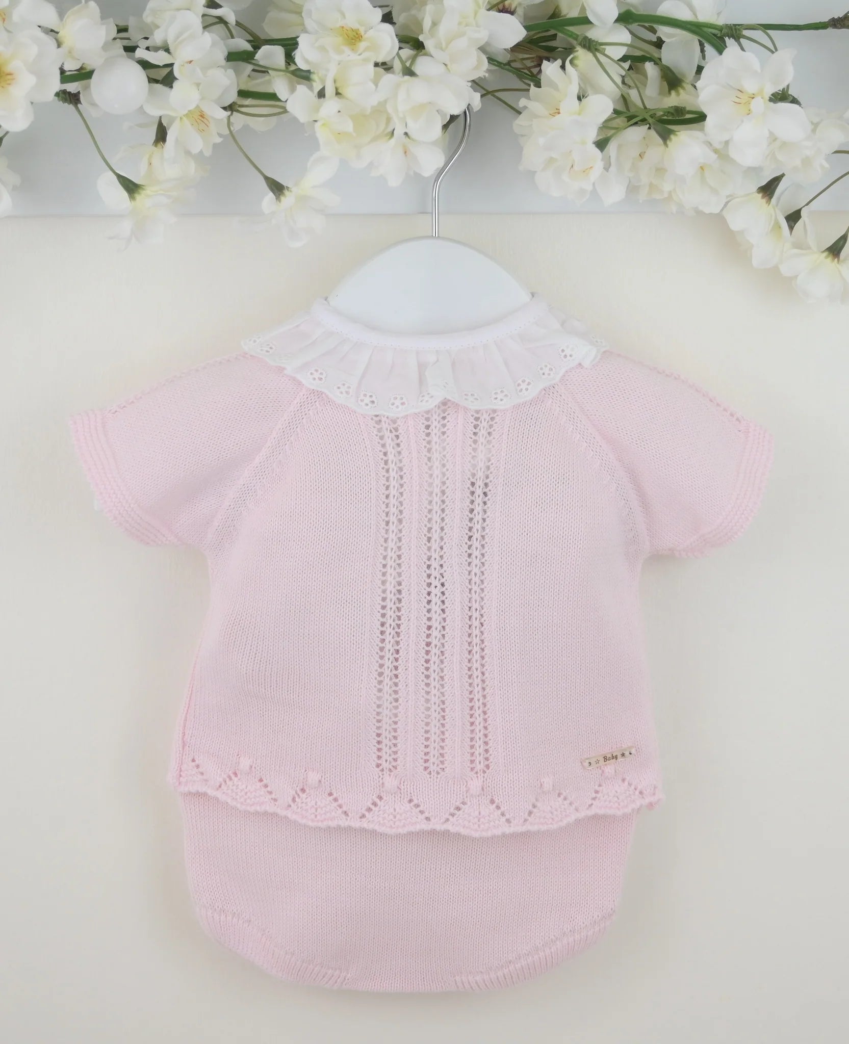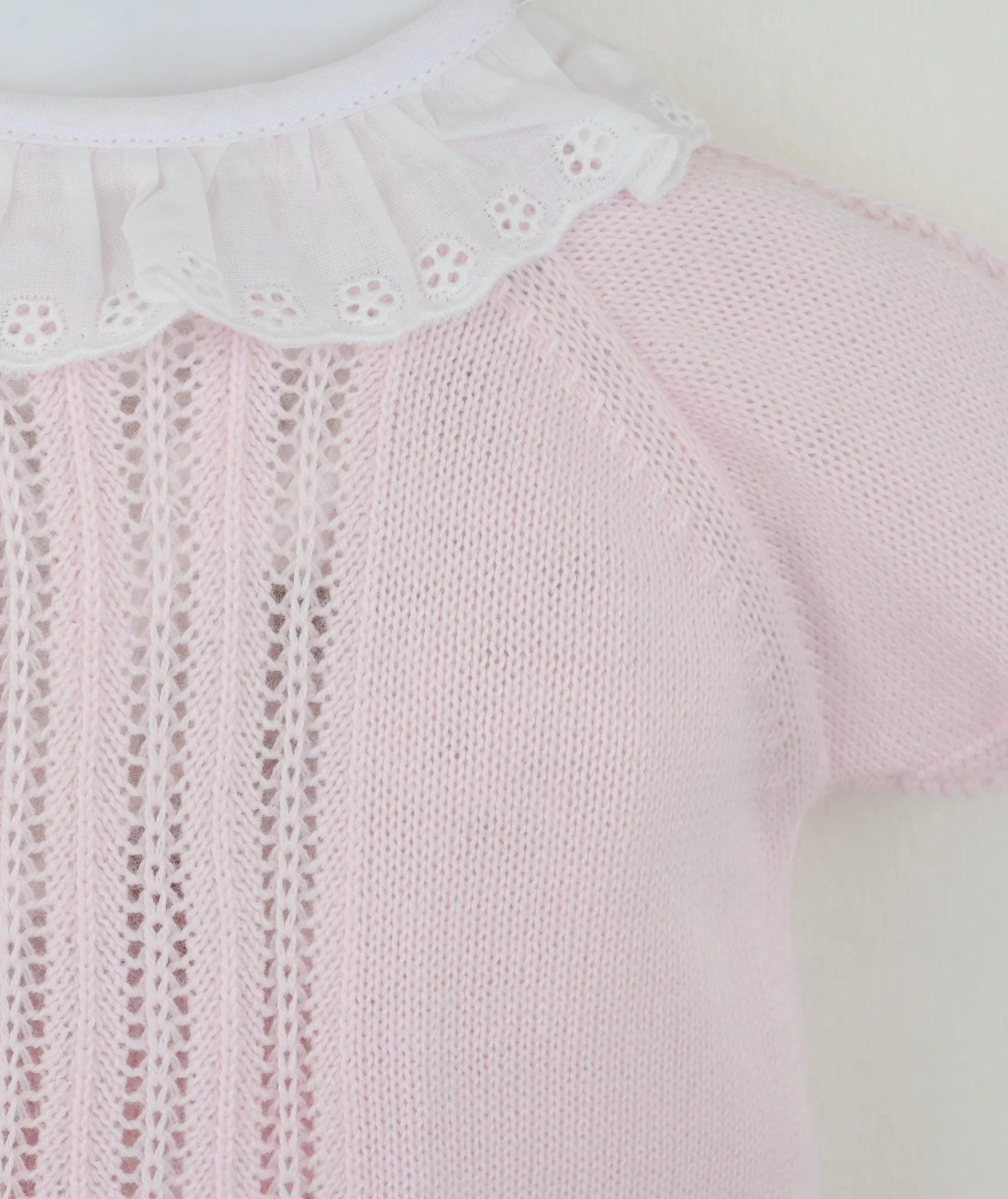The Juliet outfit in pink is crafted from a delightfully soft, airy yarn. The short-sleeved top boasts a charming scalloped hem and textured knit patterns, topped with a sweet white broderie anglaise lace collar. Easy-to-use back buttons add a practical touch. Paired with cozy, softly knitted pants, the set includes an elasticated waist for all-day comfort and play.