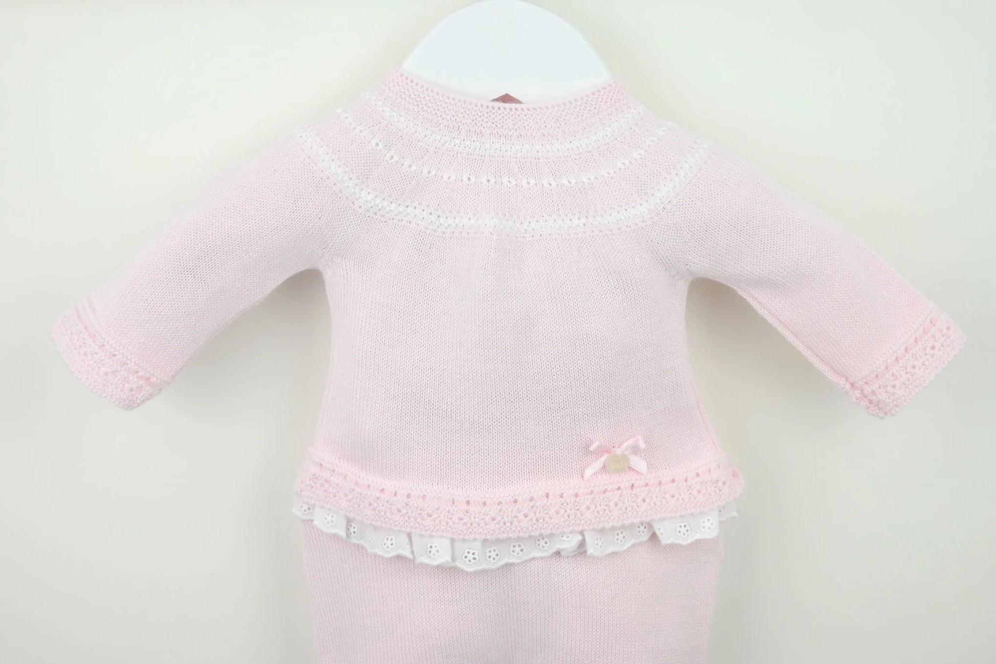 This charming three-piece knitted set for baby girls features a delicate pale pink yarn. The top is detailed with contrasting stripes at the neckline, a graceful white lace-trimmed hem, and a satin bow at the waist for added elegance. Convenient buttons at the back make dressing easy. The matching bottoms offer a comfortable fit with an elasticated waist, perfect for all-day wear.