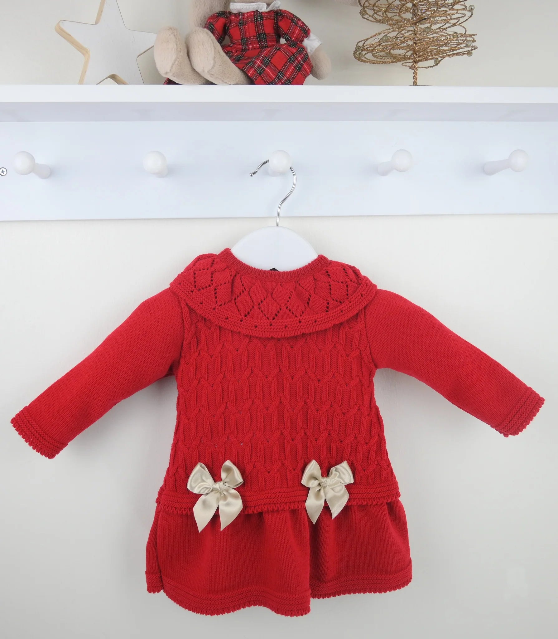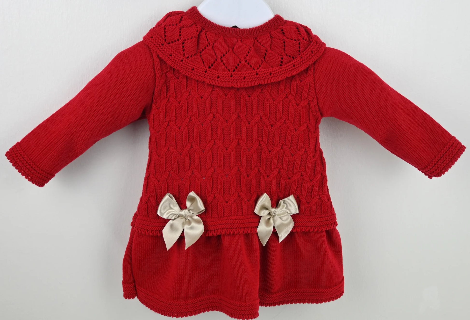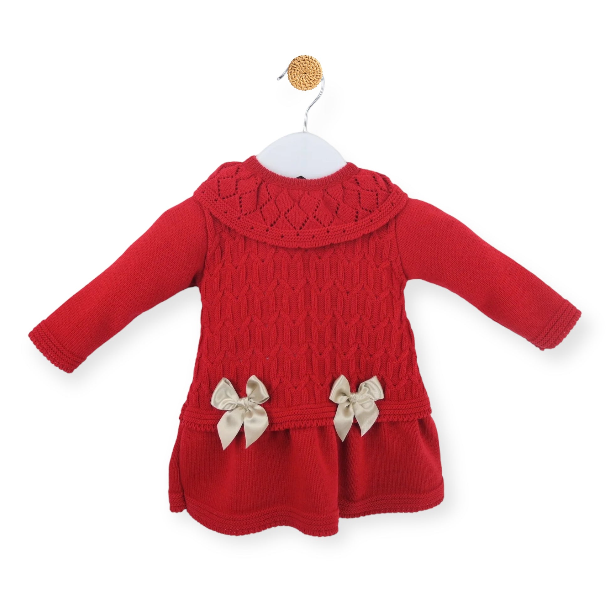 This charming Red A-line dress features a cozy knitted texture, a delightful frill collar, and two adorable bows at the waist, adding a sweet and playful touch to any outfit.