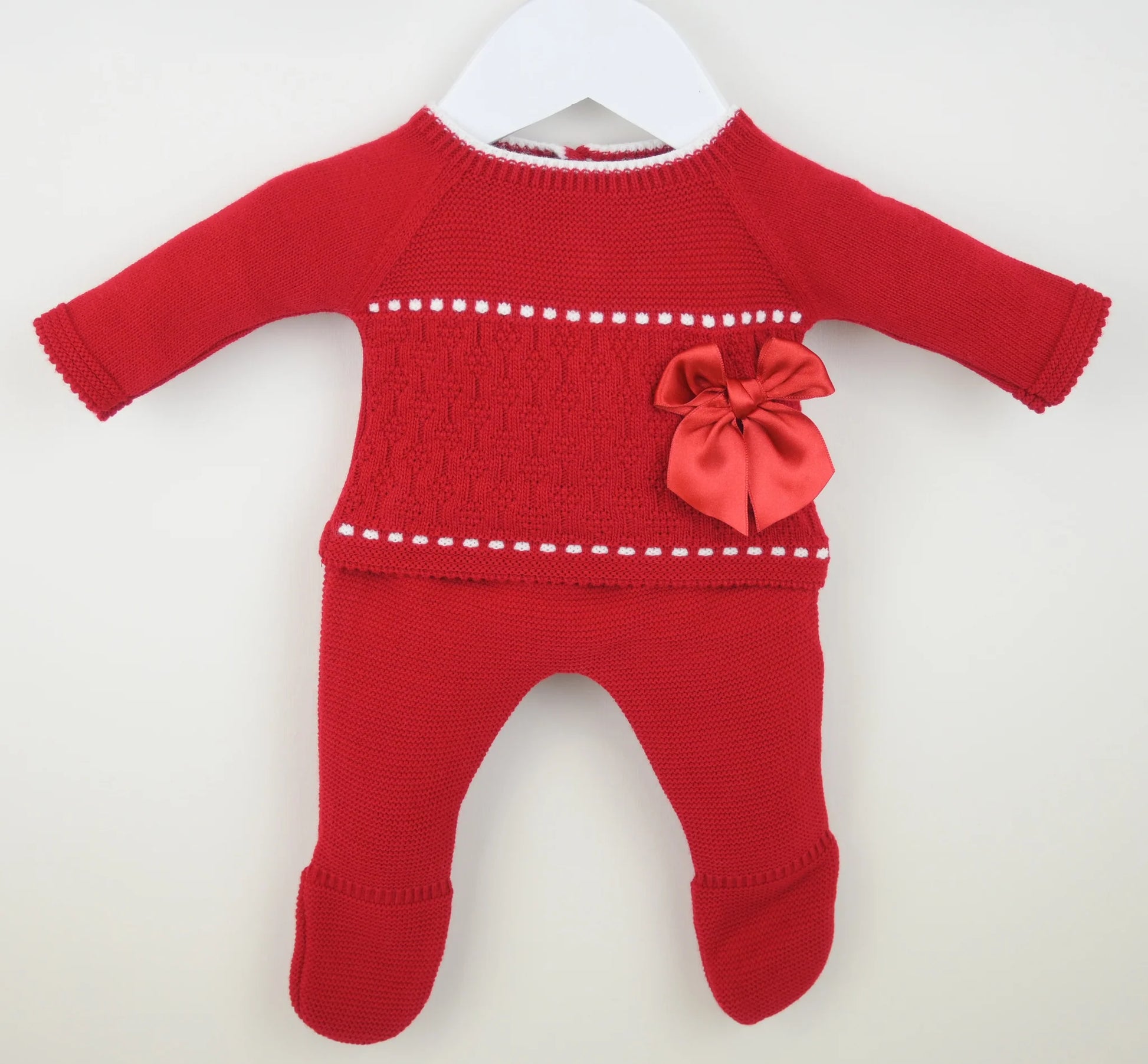 Crafted from a supersoft red yarn, this outfit is ideal for a baby’s first Christmas. The top features charming textures, contrasting stitching, and a delicate ribbon bow. Matching trousers provide warmth with enclosed feet and a soft elastic waistband for a cozy fit.