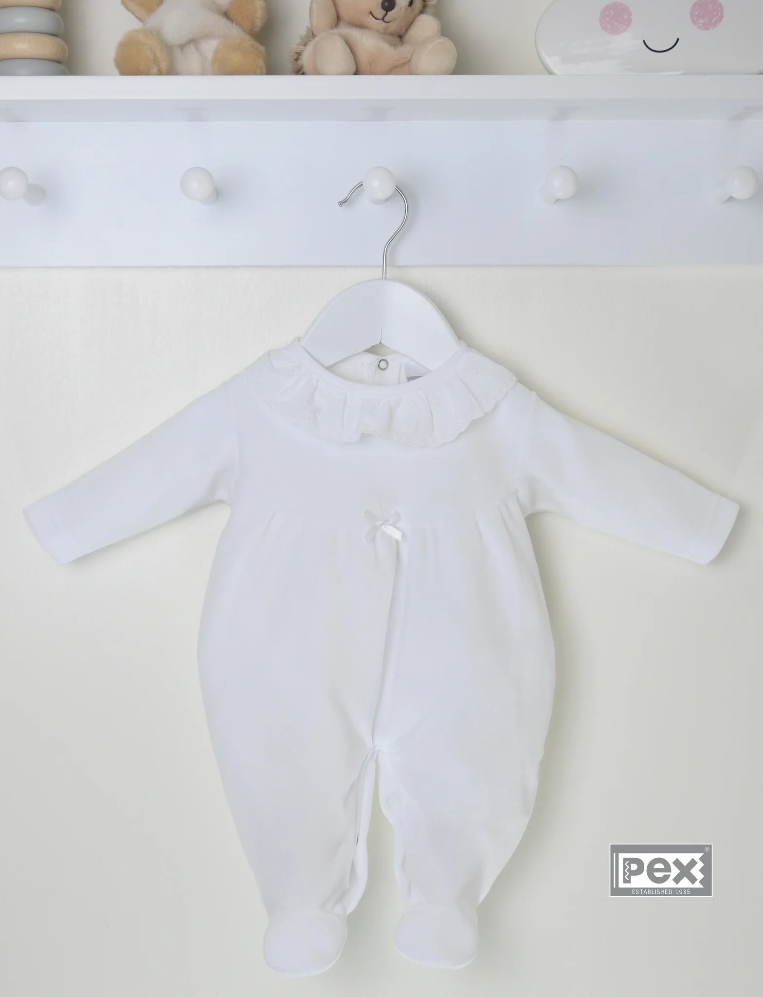 This charming new sleepsuit is crafted from luxuriously soft 80% cotton velour, enhanced with an elegant broderie lace trim along the neckline and a delicate ribbon bow at the chest. Designed for convenience, it includes practical press studs that run around the legs and down the back for easy dressing and changing.
