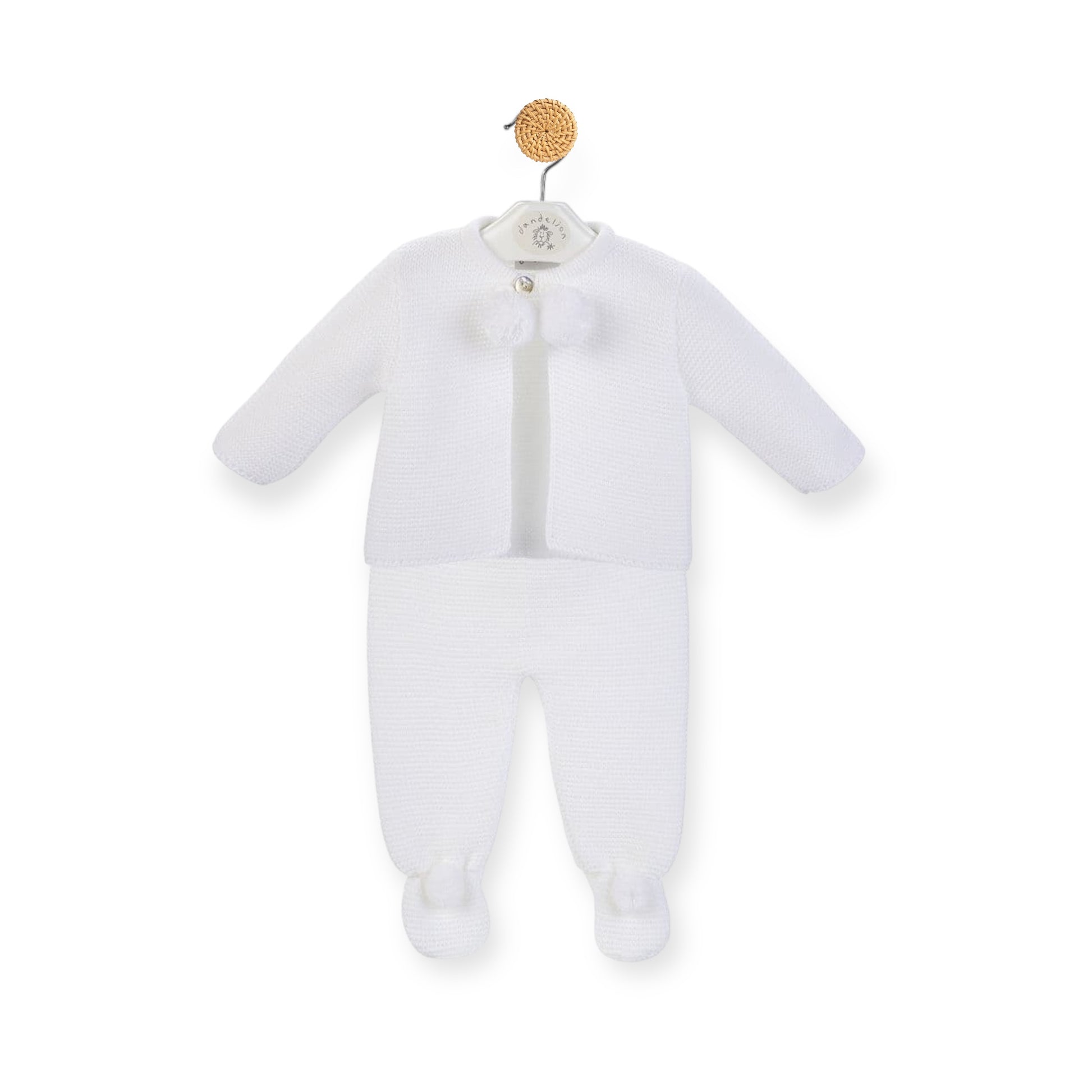 This charming set features a knitted jacket and leggings adorned with playful pompoms, crafted in Portugal with a fresh, stylish design. Perfectly cozy for any event, it’s made from easy-care acrylic fabric. Choose from four delightful colours: Sky Blue, White, Pink, and Taupe.